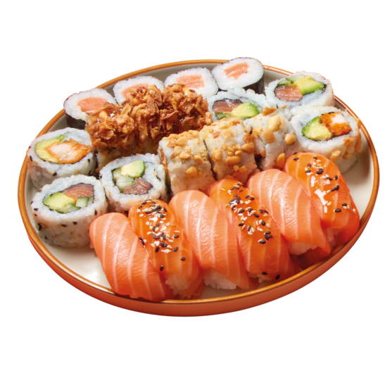 4 sushi saumon, 2 sushi thon, 6 maki concombre, 6 california saumon